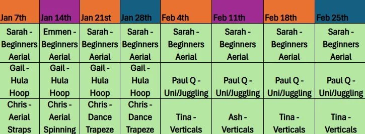 Our Adult Circus Skills class on a Wednesday night has different skill options available - whether you are a budding aerialist or completely new to Circus simply sign up. We will keep you updated here with the skills and the trainers for the term!
